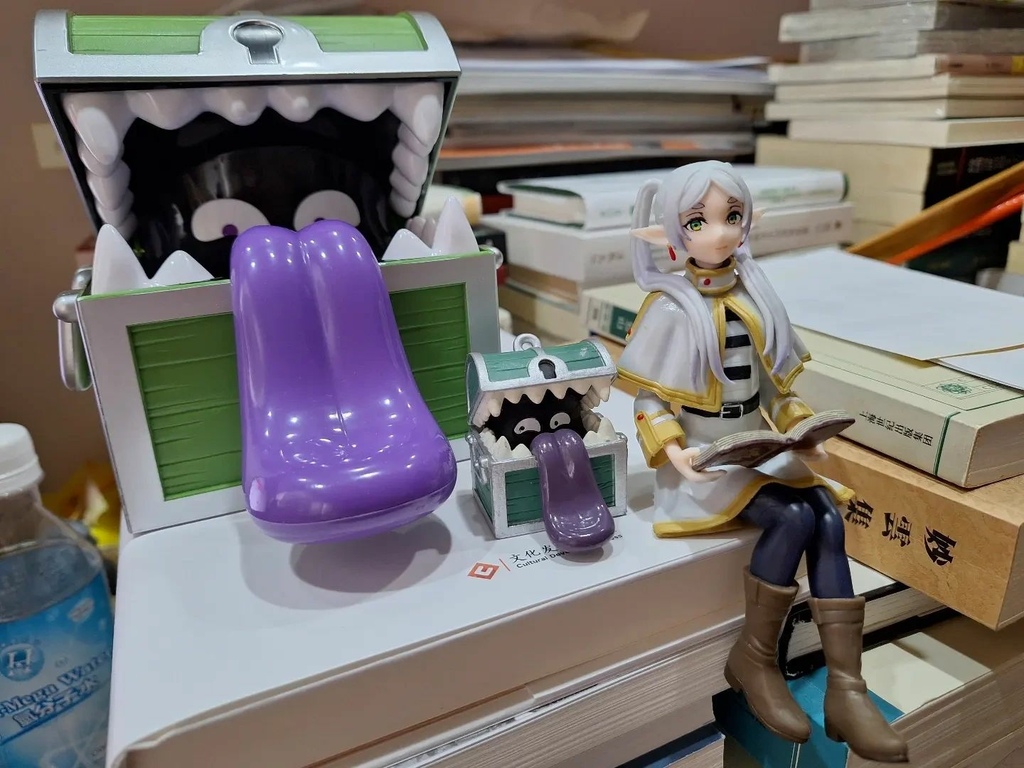 只是,看到芙莉蓮和大、小寶箱怪坐在書堆上,