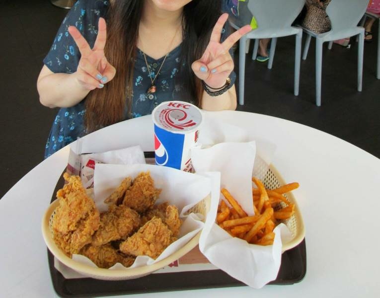 說著說著,於是她一個人吃掉4塊肯德基和薯條和可樂。